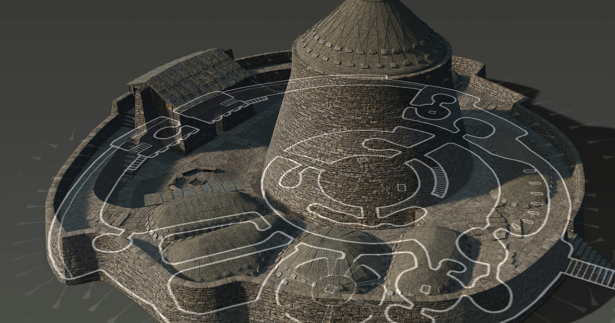 This computer 3D animation shows the replica Iron Age Broch design proposed by the Caithness Broch Project, which aims to build a full-scale replica broch using traditional techniques and create a permanent visitor attraction and dry stone workshop near the village of Latheron in the Caithness region of Scotland. Working with the project's lead architects, this image was developed from a computer 3D model produced by reconstruction artist Bob Marshall.